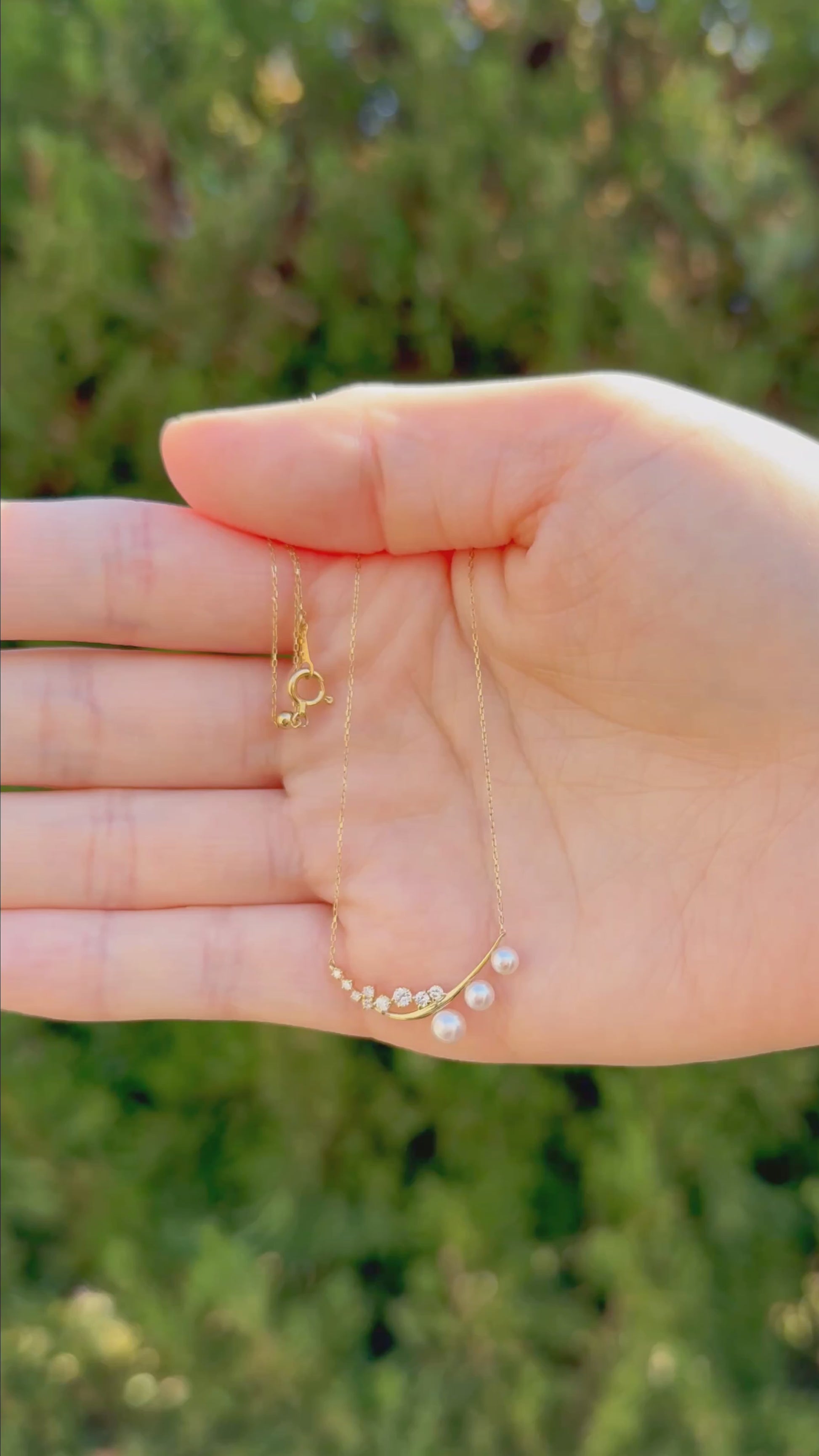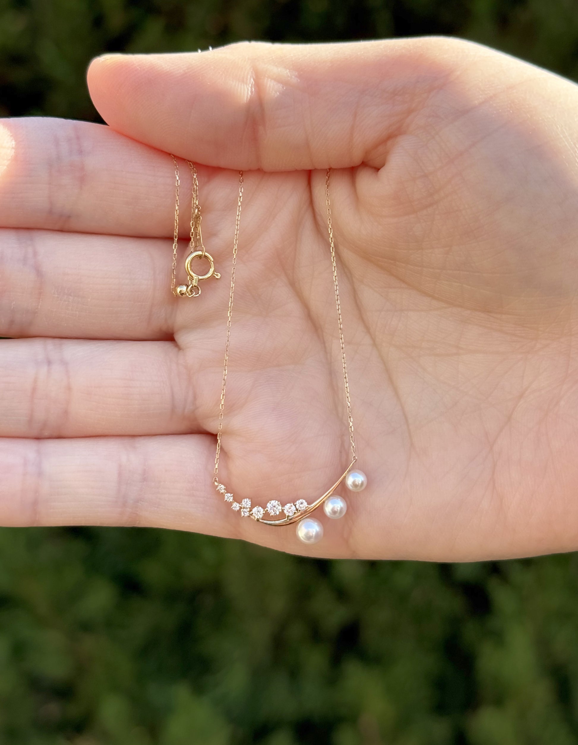 Experience refined elegance with our 18k Yellow Gold Graduated Diamond and Akoya Pearl Curve Pendant. This captivating design showcases a sleek curve of graduated diamonds that seamlessly transitions into a trio of luminous Akoya pearls, creating a striking asymmetrical silhouette. Set in warm 18k yellow gold, this pendant balances contemporary design with timeless sophistication. Perfect for adding a touch of luxury to your formal or everyday attire, this piece is a versatile addition to any jewelry collection.